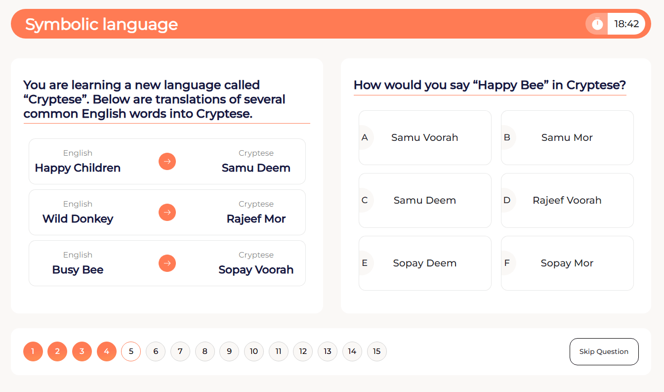 記号言語の問題では、物、概念、またはアイデアの間の関係性を描写するために記号を使用します。異なる記号の「辞書」が重なり合っている複数の列から、訳語を特定してください。